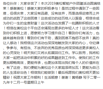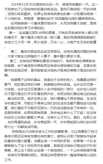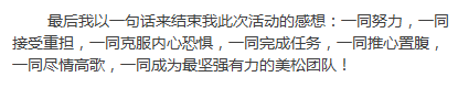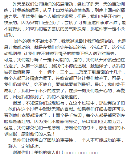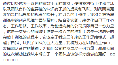 本次活動(dòng),同事們?cè)趯?shí)踐鍛煉中學(xué)習(xí),在體驗(yàn)學(xué)習(xí)中改變,受益匪淺,有了更多的人生感悟。在體驗(yàn)著奉獻(xiàn)、協(xié)作、勇敢?guī)淼某晒ο矏偤螅總€(gè)人深刻感受到|溝通、責(zé)任、協(xié)作、勇敢、自信|的精髓,以及作為團(tuán)隊(duì)中的一員所要承擔(dān)的責(zé)任,正如美松智能總經(jīng)理黃楊靜先生及同事們所言,利用周日休息天還在撰寫感悟傳遞著: