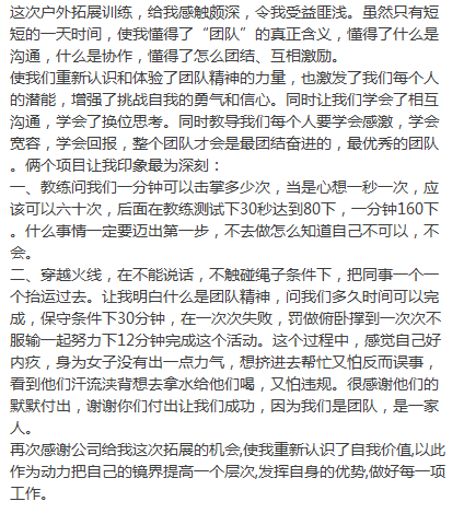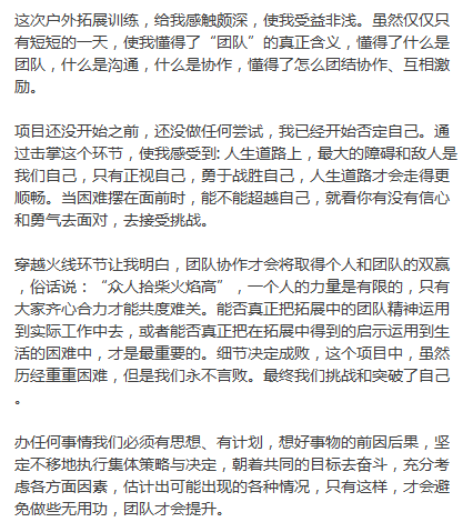 此次拓展團(tuán)建活動(dòng),不僅培養(yǎng)了大家的積極的工作態(tài)度和高度的工作責(zé)任心,充分開發(fā)了個(gè)人潛力,還讓大家深刻體會(huì)到了團(tuán)隊(duì)的力量以及相互溝通協(xié)作的重要性,這為以后的工作奠定了很好的基礎(chǔ)。離開了拓展訓(xùn)練基地,回到更為廣闊的工作環(huán)境,我們相信,只要我們充分發(fā)揮拓展活動(dòng)中互助互信的團(tuán)隊(duì)精神,把每一件工作當(dāng)作是拓展訓(xùn)練中的一次挑戰(zhàn),就沒有戰(zhàn)勝不了的困難,沒有解決不了的難題!