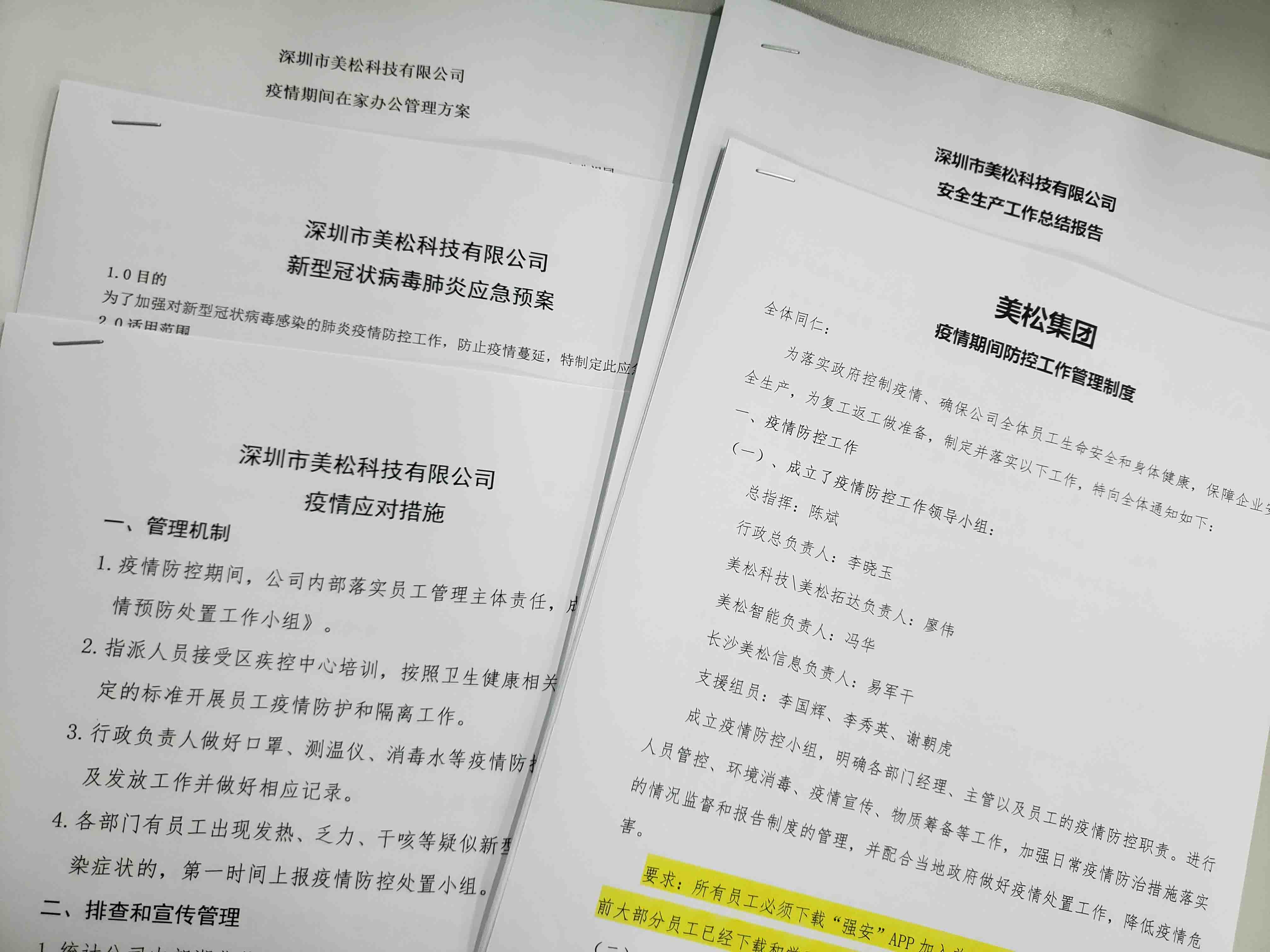 開工復工在即,我們美松集團及各下屬子公司也做了充分準備工作,面對如此特殊疫情時期,深圳美松集團特制定了《疫情期間防控工作管理制度》、《疫情期間在家辦公管理方案》、《安全生產工作報告》、《應對疫情應對措施》、《新型冠狀病毒應急預案》,利用網絡、電話、現場等多種形式相結合的方式為客戶提供服務,保障客戶需要,通過差異化的管理,做到疫情防控和經營服務“兩不誤”。無論是在家辦公,還是到崗辦公,全體員工全身心投入到工作當中,保持著積極的工作熱情。