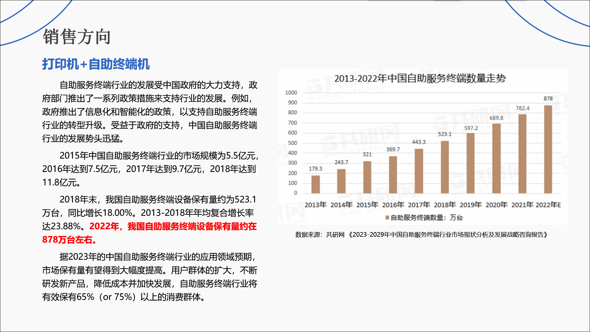 自助服務終端行業的發展受中國政府的大力支持,政府部門推出了一系列政策措施來支持行業的發展。例如,政府推出了信息化和智能化的政策,以支持自助服務終端行業的轉型升級。受益于政府的支持,中國自助服務終端行業的發展勢頭迅猛。201 5年中國自助服務終端行業的市場規模為5.5億元,2016年達到7.5億元,2017年達到9.7億元,2018年達到11.8億元。201 8年末,我國自助服務終端設備保有量約為523.1萬臺,同比增長18.00%。2013-2018年年均復合增長率達23.88%。2022年,我國自助服務終端設備保有量約在878萬臺左右。