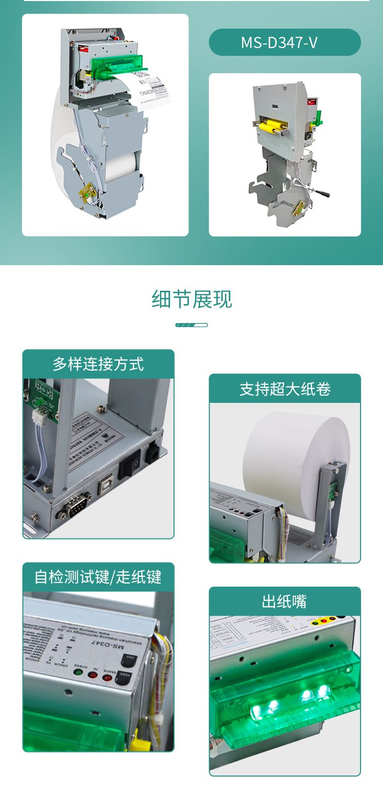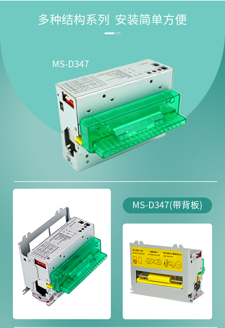 MS-D347打印機(jī)采用日本精工進(jìn)口機(jī)芯CAPD347,結(jié)合本公司自主研發(fā)MS-D347打印控制板及鈑金結(jié)構(gòu)組合而成的80MM 自動(dòng)切紙熱敏打印模組,配有防堵防拽專利技術(shù)集成度高,軟件和硬件接口兼容,其設(shè)計(jì)精巧,性能穩(wěn)定,支持不同設(shè)備定制化支架設(shè)計(jì),提升產(chǎn)品的安裝可靠性,讓終端用戶使用起來(lái)更簡(jiǎn)單、流暢.
