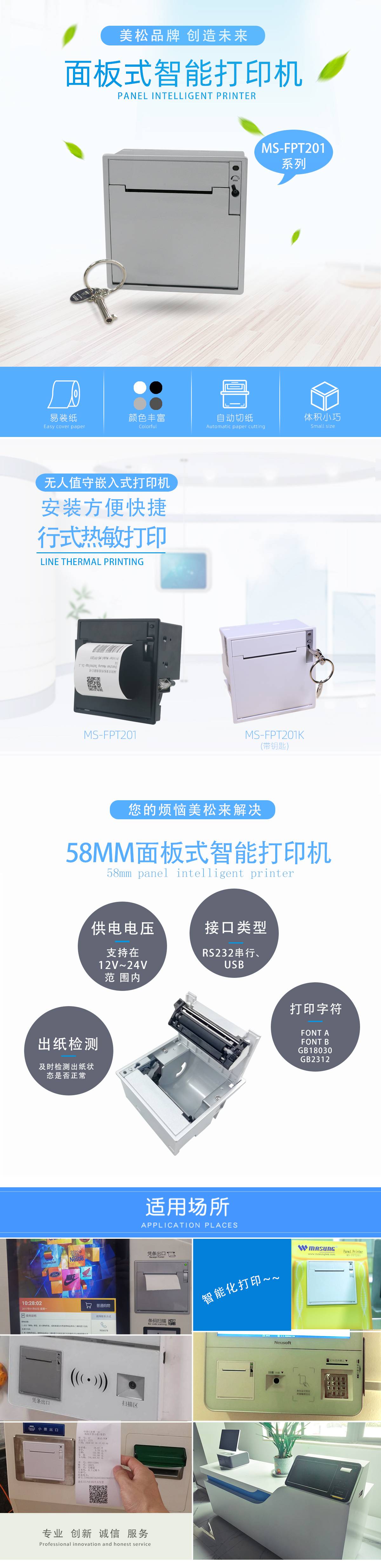 微型打印機(jī)介紹:與80mm微型熱敏打印機(jī)不同,這款是58MM的微型打印機(jī),型號(hào)為MS-FPT201微型打印機(jī)是一款58mm嵌入式微型打印機(jī),體積小巧,塑膠材料外殼,機(jī)身重量輕巧,配有鋅合金鑰匙開蓋,滿足不同需求的應(yīng)用場合,只需要簡單安裝就能實(shí)現(xiàn)打印功能的打印模塊,嵌入在不同的終端設(shè)備,例如加油站、餐飲收銀機(jī)、排隊(duì)繳費(fèi)機(jī)等,微型熱敏打印機(jī)是排隊(duì)機(jī),POS機(jī),加油站設(shè)備及醫(yī)療掛號(hào)繳費(fèi)等行業(yè)自助終端打印設(shè)備。