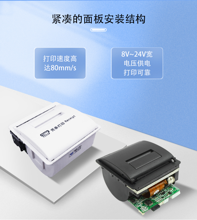 微型打印機特點:前開蓋維護,無需拆開終端設備就可實現換紙和維護,8V~12V低電壓供電58mm打印機,嵌入體積小巧
