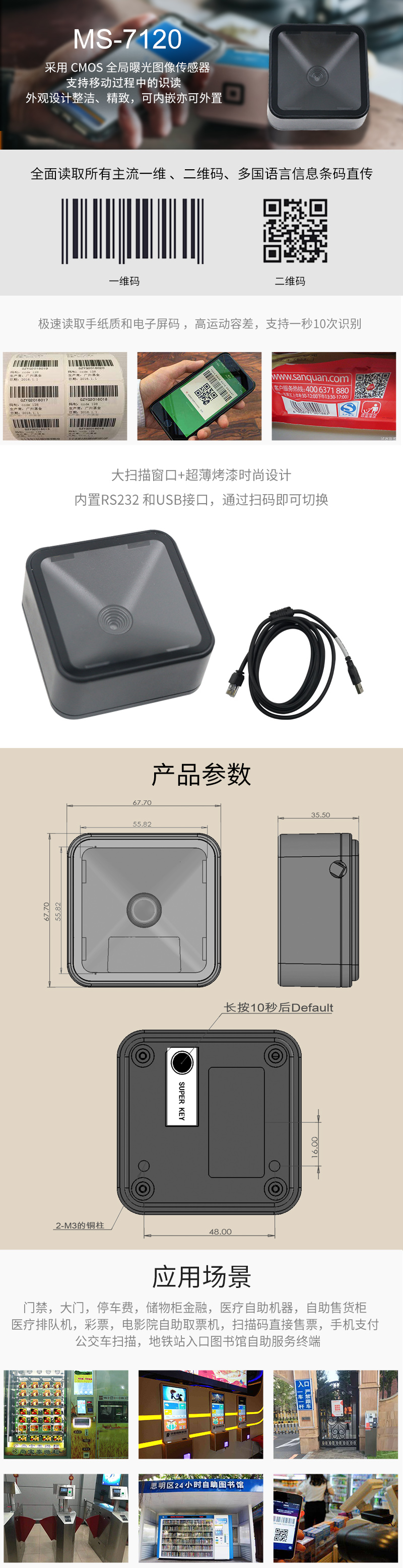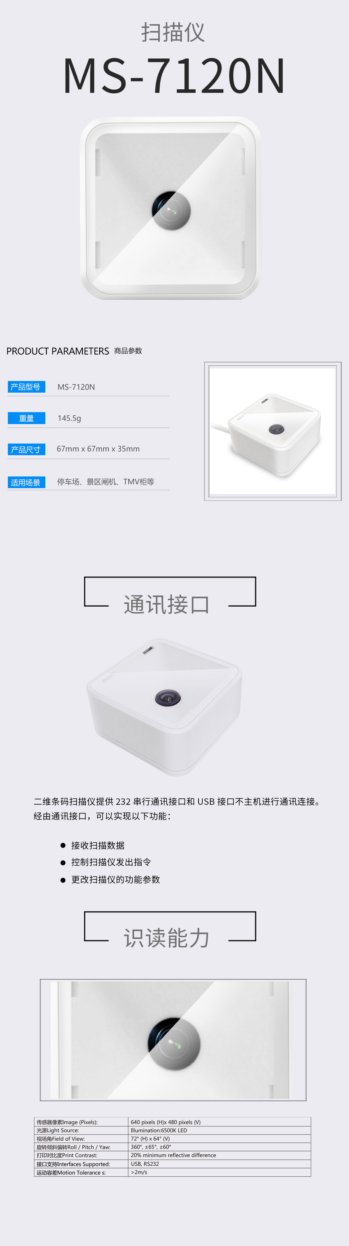 美松二維碼掃描器MS-7120N掃描器采用CMOS全局曝光圖像傳感器,支持移動過程中的識讀,全面兼容主流一維碼,二維碼.同時支持紙質(zhì)條碼和電子屏條碼的識讀.掃描成功有蜂鳴器和指示燈提示,外觀設(shè)計整潔,精致,可內(nèi)嵌亦可外置.MS-7120N二維碼掃描器得益于二維影像技術(shù)及優(yōu)秀的Hercules與專利技術(shù),可以非常容易且準(zhǔn)確地識 讀條碼符號,即使條碼符號處于任意旋轉(zhuǎn)角度,都不會影響識讀.在掃碼時,將掃描儀投射的瞄準(zhǔn)指示光束對準(zhǔn)所需讀取的條碼符號上即可.