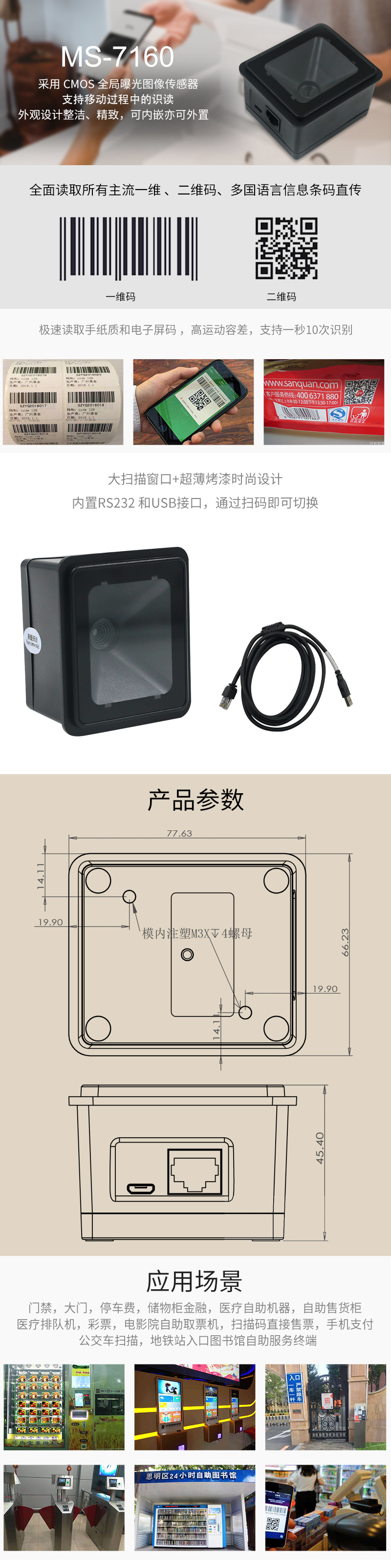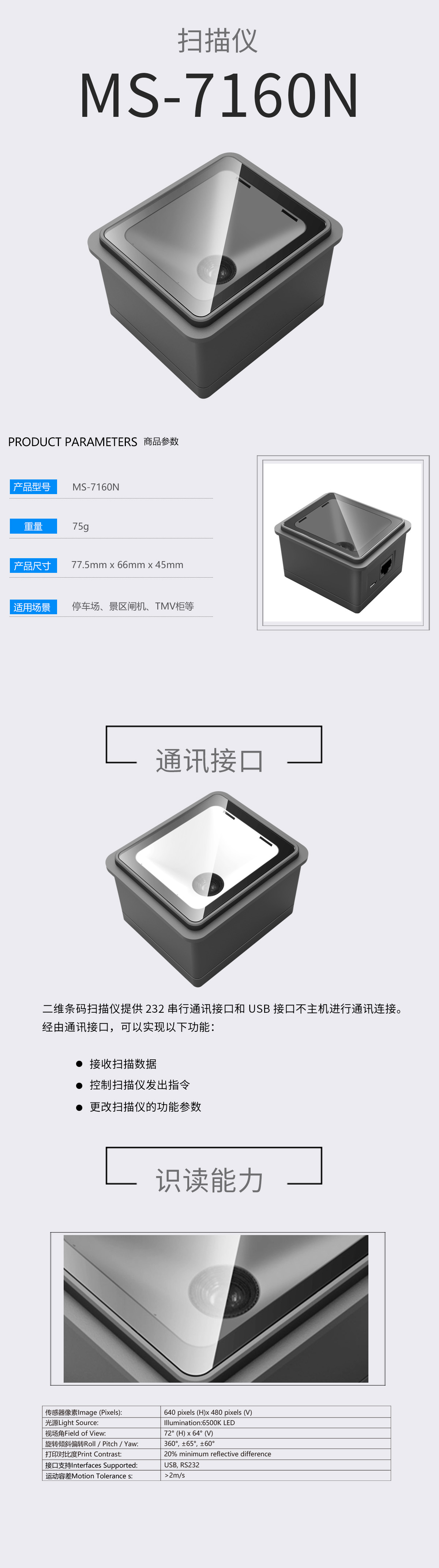 美松嵌入式掃描模塊MS-7160N掃描物體自感應,多國語言條碼信息直傳,內置RS232和USB接口,大視角影像感光器,支持紙質條碼和無背光屏幕條碼讀取,二維碼掃描平臺,嵌入式掃描模塊,電子支付盒固定式掃碼盒可二次開發.全面讀取所有主流一維 ,二維碼,多國語言信息條碼直傳;物體自感應,2M/S運動容差;內置RS232 和USB接口,通過掃碼即可切換;3.3-5V寬電壓輸入,無懼電壓波動;大掃描窗口+超薄烤漆時尚設計;極速讀取手紙質和電子屏碼。