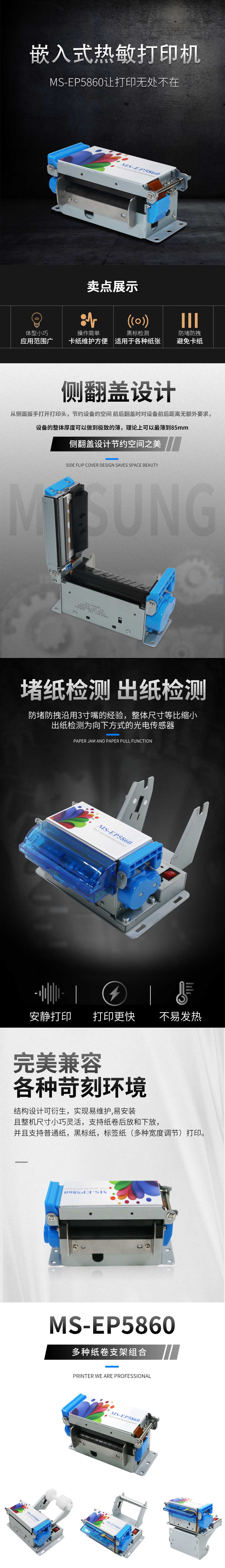 美松MASUNG自主研發嵌入式熱敏不干膠打印機 1.采用側翻蓋設計,打印質量可靠 2.集成度高,可定制不同的支架結構,便于嵌入多種終端設備 3.支持不干膠/黑標紙/熱敏紙打印 4.防堵防拽專利技術 5.采用大齒輪嵌入,打印走紙力度大,速度快