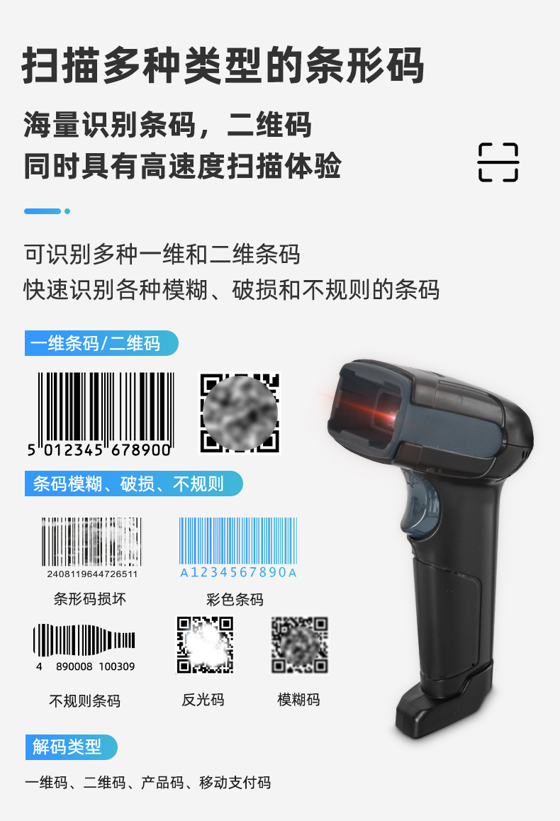 美松一二維碼影像式掃描槍MS-6100掃描采用國際解碼算法,即插即用,免驅動更簡單,對各種一維,二維條碼,紙質和電子屏碼均以快速精準解讀;尤其對殘缺碼,污損碼和變形碼有非常強的糾錯能力,兼容WINDOWS ,Linux,安卓等主流操作系統,廣泛用于零售餐飲倉庫快遞行業,手機屏幕收銀行業.