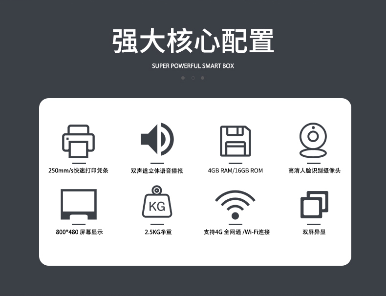 1.中央處理器六核64位,Android 6.1操作系統(tǒng) 2.智能掃一掃支付具有雙聲道立體音喇叭 3.高清AI人臉識別攝像頭,觸摸屏雙屏異顯 4.支持4G全網通/WIFI/藍牙連接,支持微信支付寶云閃付等移動支付