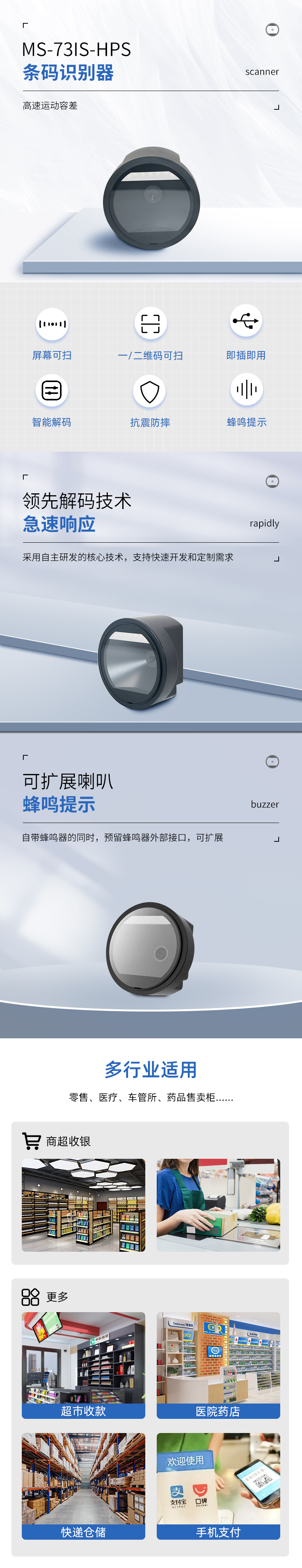 1.針對零售碼特殊優化 2.褶皺殘缺電子秤條碼算法補償 3.百萬像素 4.可擴展喇叭 5.USB和RS232串口支持 6.廣角 7.高運動容差