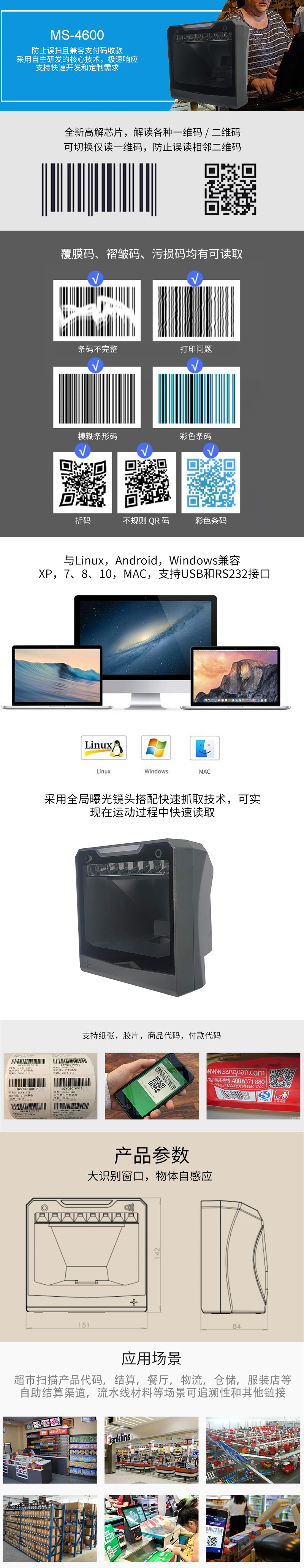 全面支持一維、二維碼;多國語言條碼信息直傳 百萬像素,支持低于4mil條碼識讀 輕松切換一維二維模式 ,避免誤掃 150*155mm窗口,超大真實視場角度 1/100 秒急速掃描,無需對焦 支持紙質,薄膜類,商品碼,付款碼讀取 支持低對比度、高密度的DM碼等的讀取