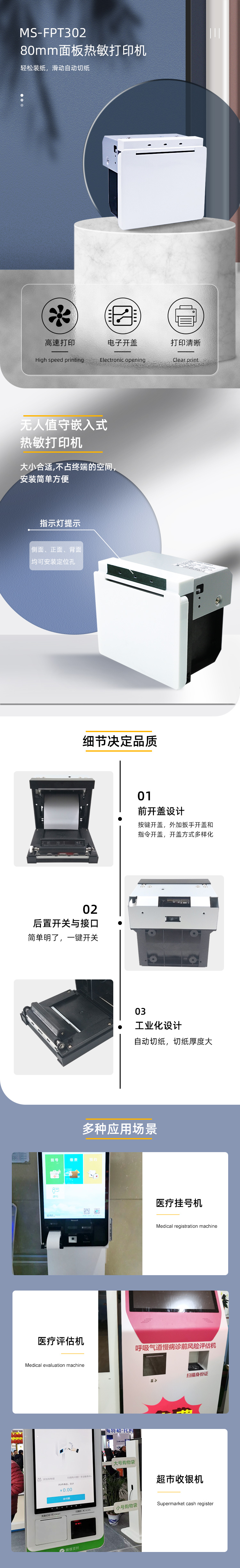 嵌入式熱敏打印機(jī) 1.高速熱敏打印、噪聲低、可靠性強(qiáng)、切紙厚度大等特點(diǎn) 2.MS-FPT302定位孔可安裝在側(cè)、前、后三面,安裝維修方便快捷 3.易裝紙、滑動(dòng)式自動(dòng)切紙等功能 4.紙將盡可手動(dòng)調(diào)節(jié)大小,最精確的紙將盡檢測(cè)(可精確張數(shù)) 5.開蓋方式:扳手開蓋;電子開蓋;電腦指令開蓋 6.多樣傳感器協(xié)助控制且?guī)в卸录埰鳈z測(cè)功能 7.無人值守內(nèi)嵌式熱敏打印機(jī) 8.醫(yī)療、政務(wù)、零售、餐飲等行業(yè)的自助終端打印設(shè)備