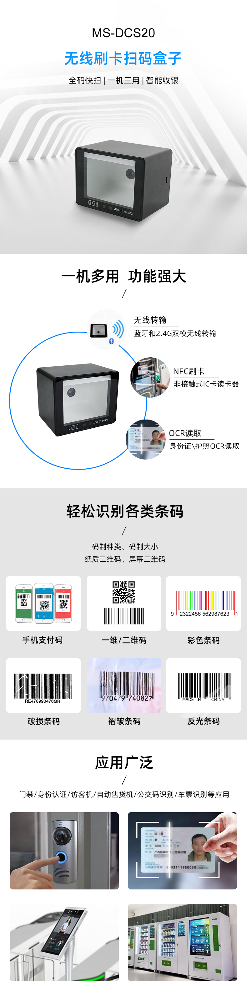二維碼掃描器行業(yè)應(yīng)用:二維碼掃描器MS-DCS20可桌面亦可嵌入、會(huì)議簽到、訪客機(jī)、門(mén)禁、身份認(rèn)證、身份證護(hù)照OCR讀取,支付、醫(yī)療自助、排隊(duì)機(jī)等,尤其適用于高密紙質(zhì)、手機(jī)碼、要求貼近掃描、需要讀身份證OCR、刷IC卡、無(wú)線傳輸應(yīng)用的場(chǎng)景。二維碼掃描器MS-DCS20實(shí)現(xiàn)藍(lán)牙和2.4G雙模傳輸;選配刷卡模塊可支持13.56Mhz 非接觸式 IC 卡讀卡器,支持 Type A/B 卡識(shí)讀;OCR讀取可讀取OCR-A/B數(shù)字,領(lǐng)先的解碼技術(shù),采用自主研發(fā)的核心技術(shù),極速響應(yīng),支持快速開(kāi)發(fā)和定制需求。