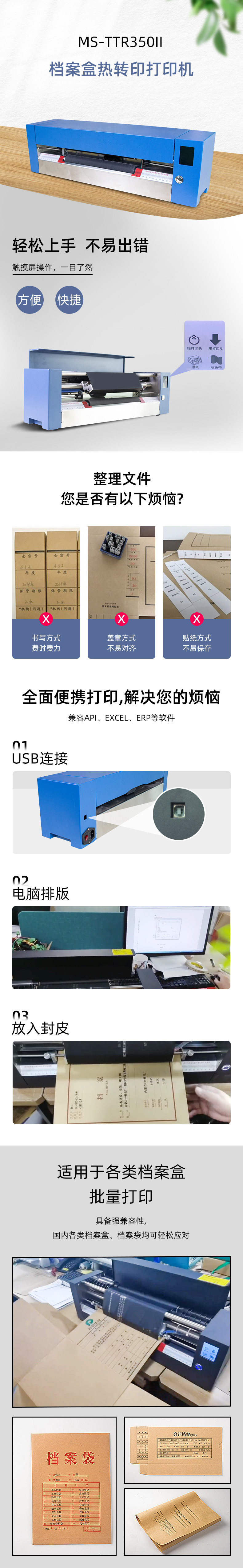 美松MASUNG自主研發A3+標準檔案盒封面打印機 1.專業打印牛皮紙,證件內頁,無酸紙檔案盒 2.對接API,EXCEL,ERP等數據庫專業的編輯軟件,自定義打印 3.USB連接操作簡單,耗材成本低,長久保存 4.智能打印,整齊規范化,助力智慧辦公
