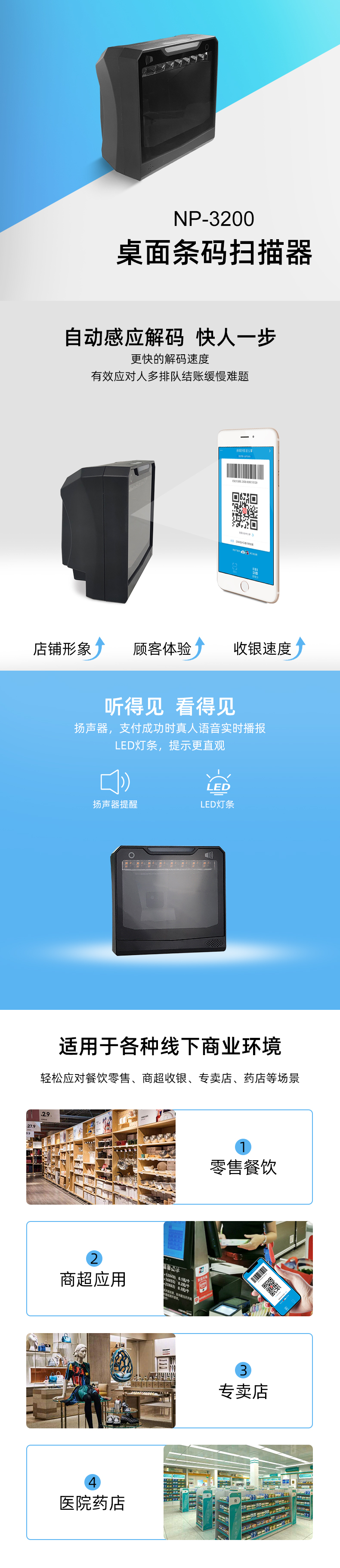 全新的觸摸屏模式,讓模式切換更順暢 可隨意調節聲音大小 適用于各種新零售行業,紙質條碼與手機條碼間流暢切換