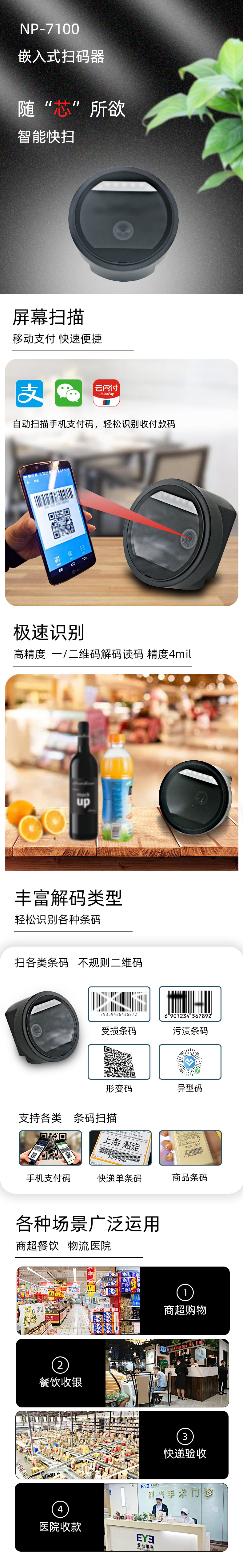 極速識讀各種商品碼和支付碼 嵌入式設計,外形簡約、大氣 62MM厚,結構設計更方便