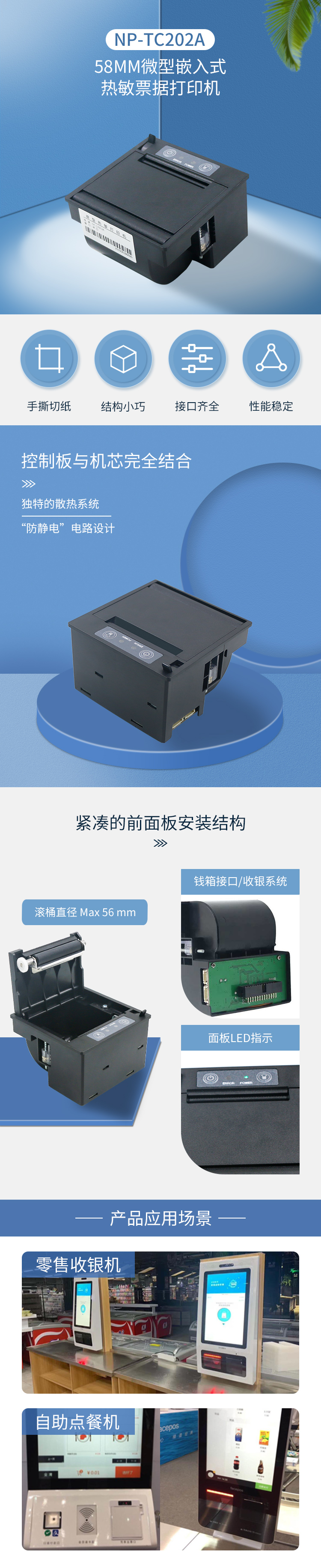 1.易裝紙結構 2.低噪音熱敏打印 3.可選不同的接口 4.支持圖文打印 5.紙卷60毫米外徑紙卷 6.大齒輪、大膠輥、大馬達機芯設計耐用可靠 7.支持Web打印,以及多種驅動Windows,Linux,Android