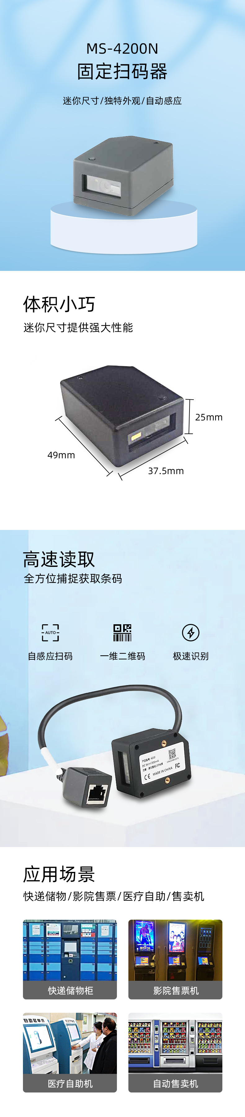 美松嵌入式二維碼條碼掃描器 1.兼容紙質和電子屏,一維和二維條碼均可識讀 2.自帶補光燈掃描基準線,更易掃面單類紙質條碼 3.體積非常小巧,非常適合手持機和空間狹小情況下使用,自帶蜂鳴器提醒