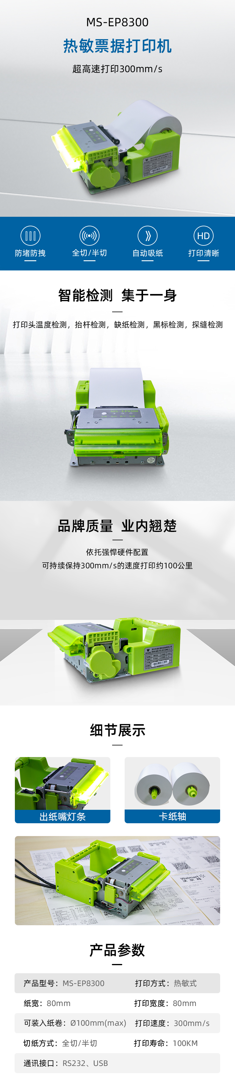 以“清新綠”作為主色新一輪創新的美松特色產品上市,在顏色上凸顯清新脫俗的生命力和綠色環保低碳的生活理念,讓人耳目一新; 在高效率打印技術上也突破了以往的打印速度,高配版本達到300mm/s,在保證打印質量的同時,超快打印速度 打印頭側翻蓋設計,維護簡單; 增加防堵紙檢測傳感器等功能,打印工作將故障排除在千里之外; 搭配100毫米直徑的紙卷,減少換紙頻率; 優化外觀設計,選擇優質圓潤的塑膠外殼,操作使用更加安全可靠; 一款打印寬度為80mm的熱轉印打印機,最大紙卷寬度為100mm