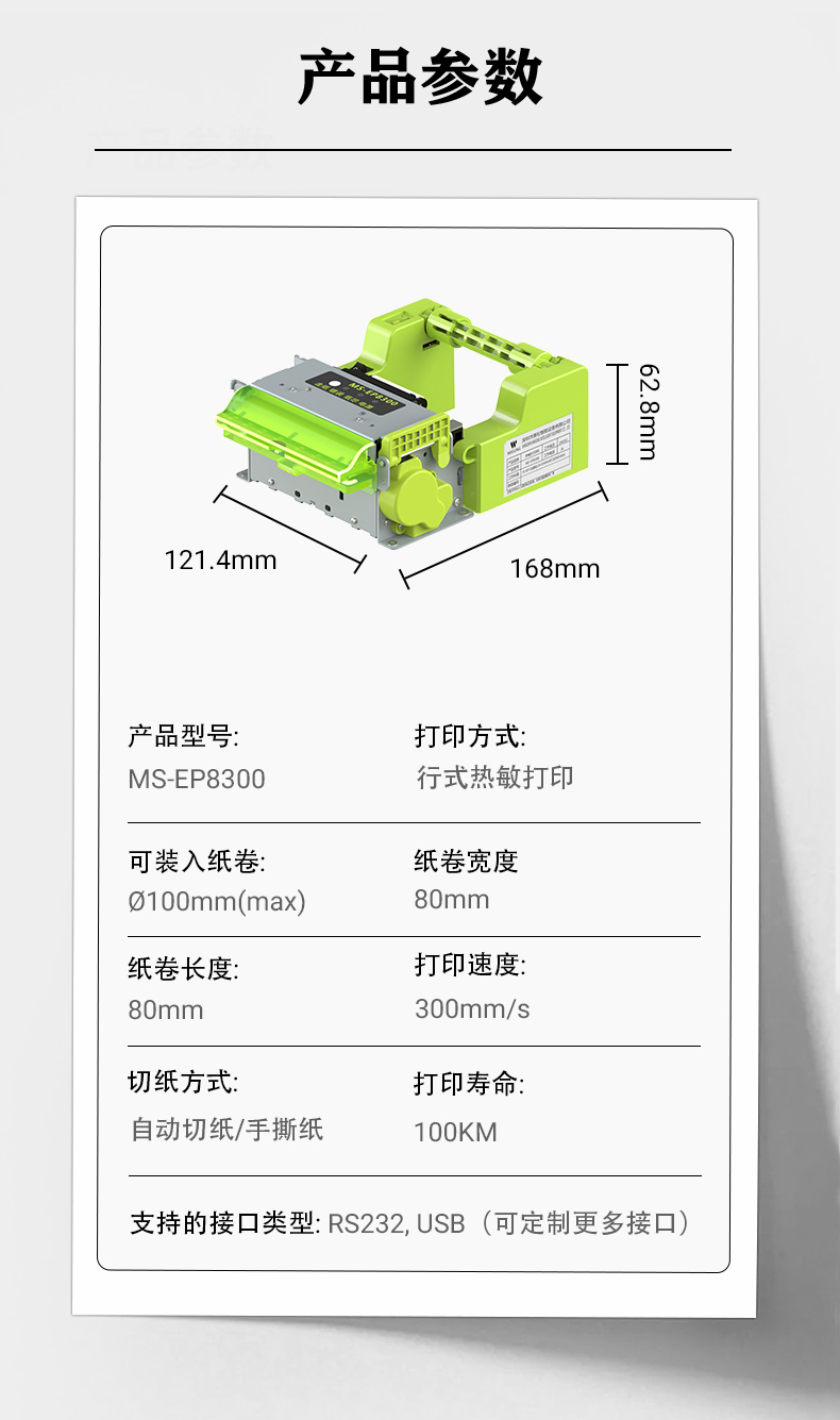 MS-EP8300作為由美松最新自主研發的高速熱敏票據自助打印機,采用了最新的“清新綠”配色,在外觀上具有獨特的配色美感,,打印速度最高可達到300mm/s,是一款超高速的打印機,具有多種接口類型可供選擇,RS232接口和USB接口,在操作上還具有多個提示燈和發光出紙嘴可選,,