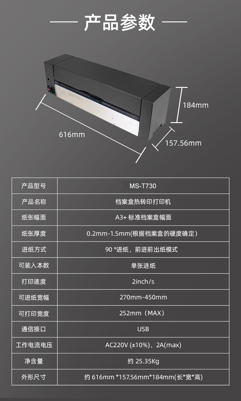美松MASUNG自主研發A3+標準檔案盒封面打印機 1.專業打印牛皮紙,證件內頁,無酸紙檔案盒 2.對接API,EXCEL,ERP等數據庫專業的編輯軟件,自定義打印 3.USB連接操作簡單,耗材成本低,長久保存 4.智能打印,整齊規范化,助力智慧辦公