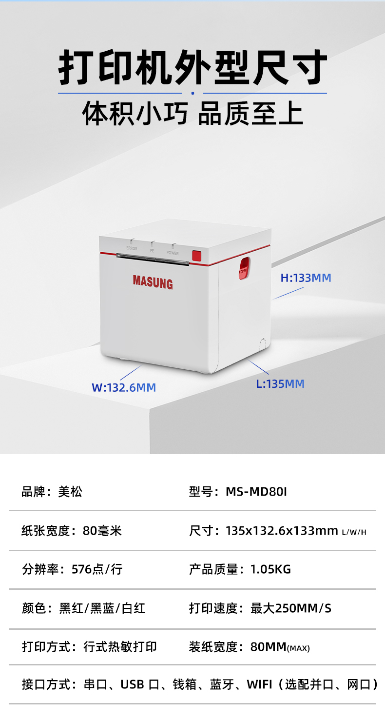 MD80I是一款高顏值的可桌面也可壁掛的票據打印機。MD80I外形四四方方的,圓潤一體設計、簡于外,精于內。流線造型,外觀簡潔大方。顏色搭配顯得更加干凈整潔,可內嵌于一些自助ai設備上,也可直接進行使用。MS-MD80I是一款全能的桌面式壁掛式票據打印機,適用于零售商超、中小電商、倉儲物管、影院娛樂等行業領域,支持簡體/繁體、英/日/韓文多種國際語言,新零售、跨境電商、影院更適合。MS-MD80I擁有超高速打印速度,采用高級強勁機芯,打印速度可高達250MM/S成為市面上同類產品中快速打印的佼佼者,清晰穩定與高速皆可兼得帶來顧客滿分體驗。MS-MD80I擁有豐富的可選接口,支持RS232串口、USB、網口,可選配藍牙、WiFi等接口、同時支持24V錢箱接入、滿足不同的連接需求。專業黑標定位功能,前出紙打印,無線連接,藍牙接口連接,WiFi接口連接,USB連接,打印機外殼材質高端,內置機芯打印速度快。