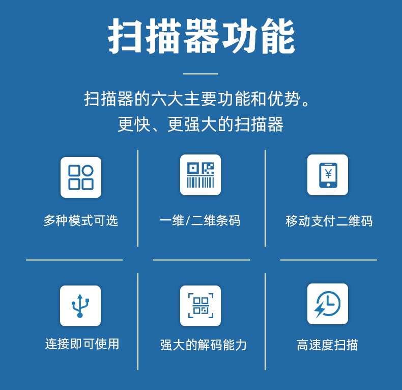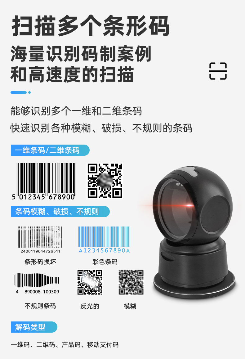 產品特點: 全局高速解碼技術 采用自主研發的核心技術,極速響應, 支持快速開發和定制需求 采用二維掃描技術 兼容一維碼和二維碼的讀取 手機和紙質條碼讀取 采用高速曝光算法,兼容手機碼和紙質碼的 快速讀取 支持多國鍵盤 對不同國家場景可配置對應輸出鍵盤 褶皺殘缺碼優化 對褶皺和殘缺條碼進行算法優化,條碼可識讀率更高 應用場景: 商超、餐飲、收銀等場景。