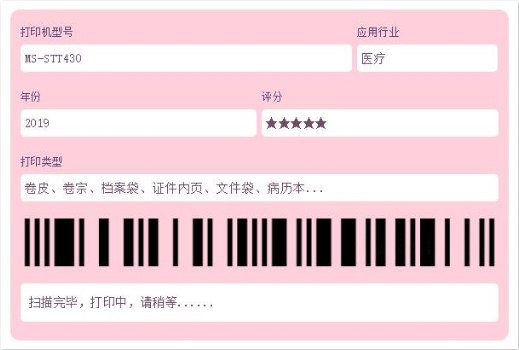 美松公司與醫療器械行業的合作案例接連不斷,58mm嵌入式打印機系列之MS-FPT201K被廣泛應用于各類醫療檢測儀器及泌尿系統自助分析檢測機中;它具有機身紙倉一體式設計且具有面板式嵌入安裝特點,更加便捷的被安裝于各類自助終端內;支持打印統計圖表的功能,在醫療器械輸出信息中具有更加直觀的顯現。產品MS-LP212系列則具有打印分離不干膠功能,被廣泛應用于醫院化驗科室設備中,為化驗樣本提供標簽打印、快速分離底紙和標簽,緩解在科室打印量的壓力。日均人流量過萬的門診部門,病歷打印著實是一個使院方管理頭疼的問題,美松公司針對醫院病歷打印研發出一系列創新型整機產品,專門針對不同打印規格的病歷本設計的可調節紙倉打印機MS-STT430系列,采用碳帶熱轉印方式針對已印刷的卷皮、卷宗、檔案袋、證件內頁、文件袋、病歷本等封面進行二次加印的打印設備。