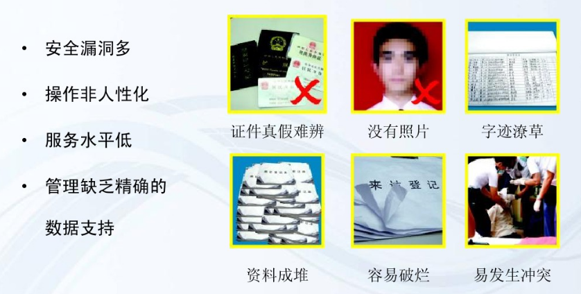傳統人工手寫的來訪登記方式存在很多安全漏洞,如今假證橫行,辦理假證的犯罪手法也是日漸高明,直接導致門衛無法用眼識別真假證件,并且人工登記復雜、繁瑣、紙質登記不易保存查詢信息。網上經常有報道訪客手工登記管理漏洞引發的安全事件接二連三,因為傳統的訪客手工登記存在的問題太多。