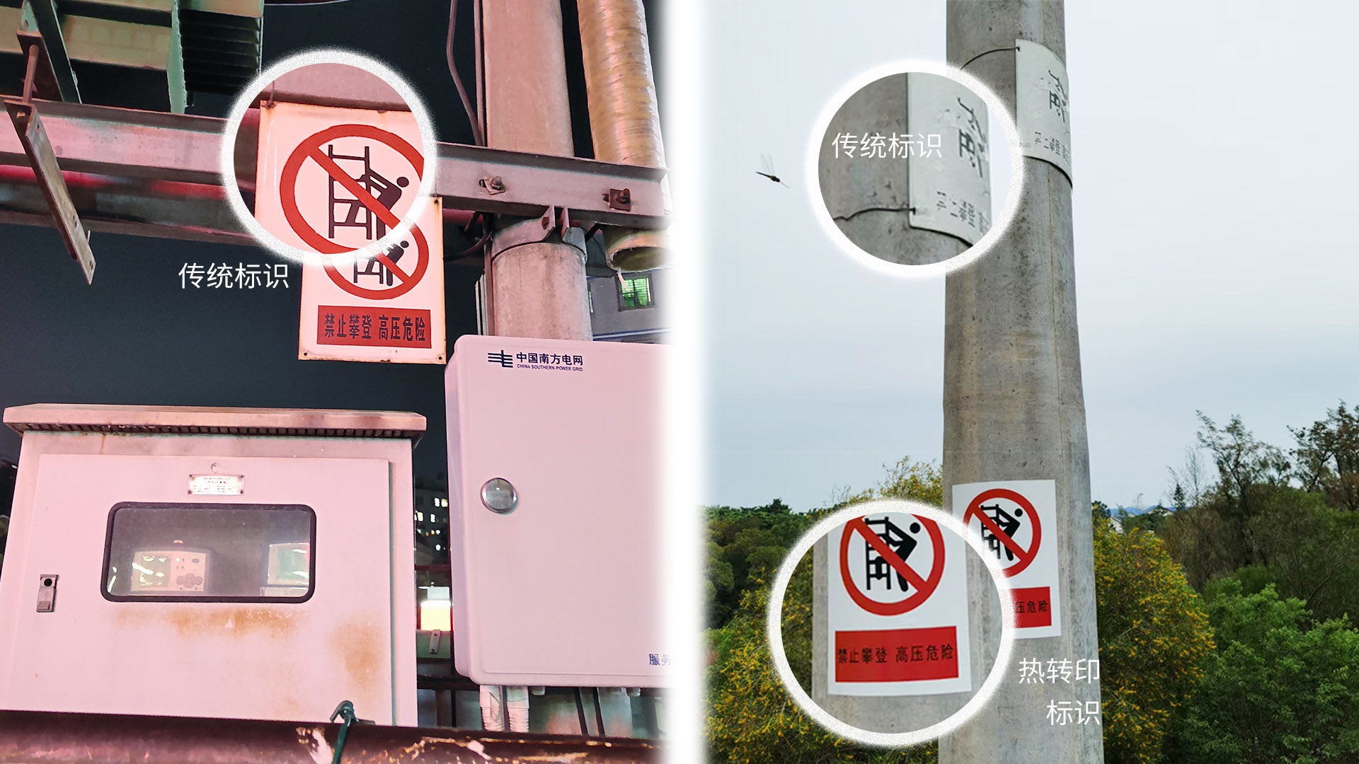 熱轉印技術的創新,在標識制作領域掀起了一場變革。傳統搪瓷、鋁合金、不銹鋼標識造價高、生產周期長、使用壽命短、不能重復利用且材料材質不統一,給電力電網、鐵路交通、公路等各行業的標識管理帶來巨大困擾。美松通過自主創新,為標識應用領域帶來了智能、高效、節約的創新管理模式。下圖是熱轉印標牌替換傳統工藝制作的標牌對比圖。